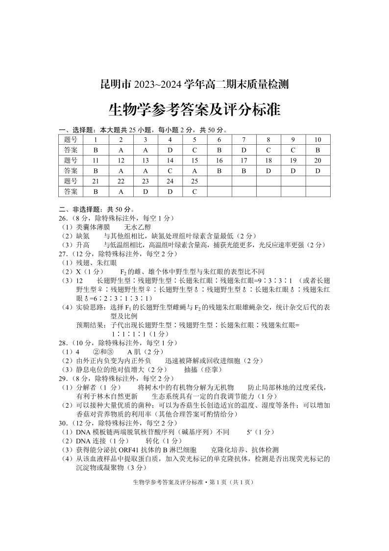 云南省昆明市2023-2024学年高二下学期期末质量检测考试 生物答案