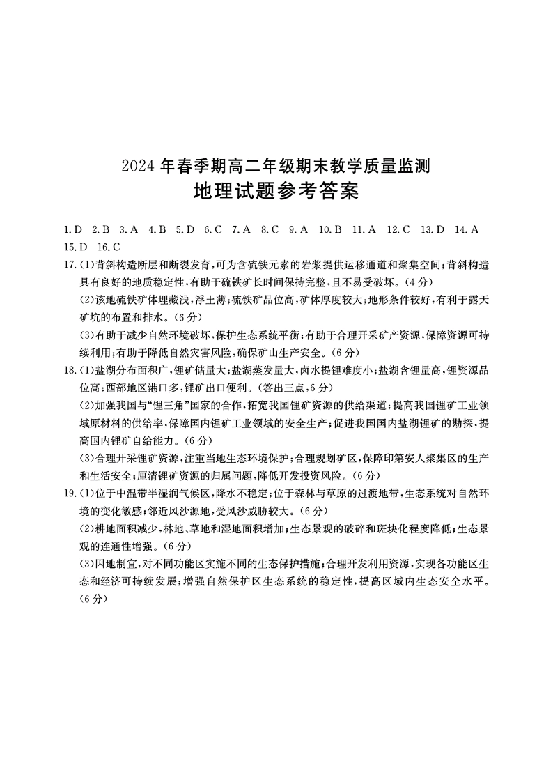 贵港2024年春季期高二年级期末教学质量监测 地理答案