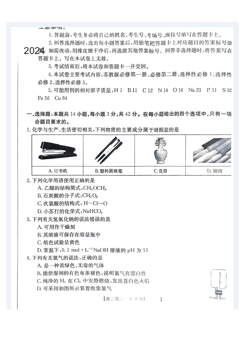 贵港2024年春季期高二年级期末教学质量监测 化学