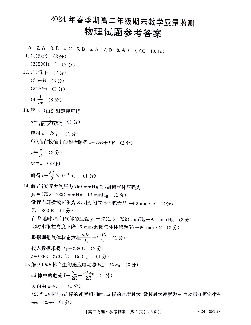 贵港2024年春季期高二年级期末教学质量监测 物理答案