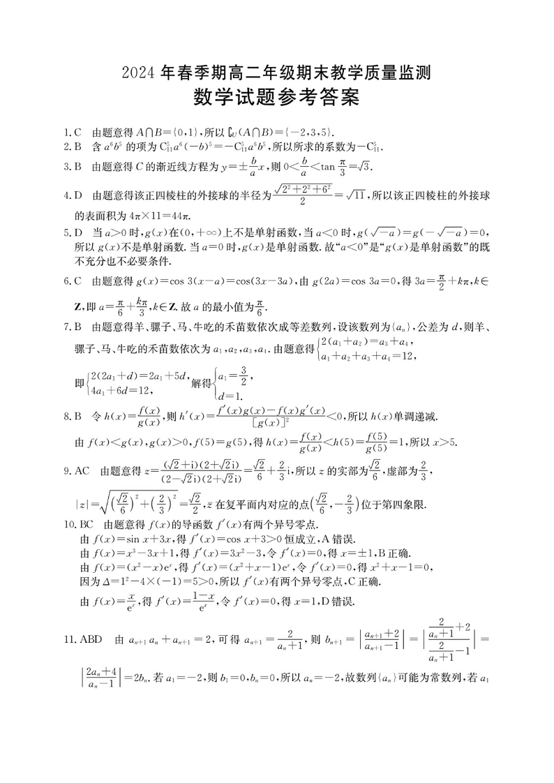 贵港2024年春季期高二年级期末教学质量监测 数学答案