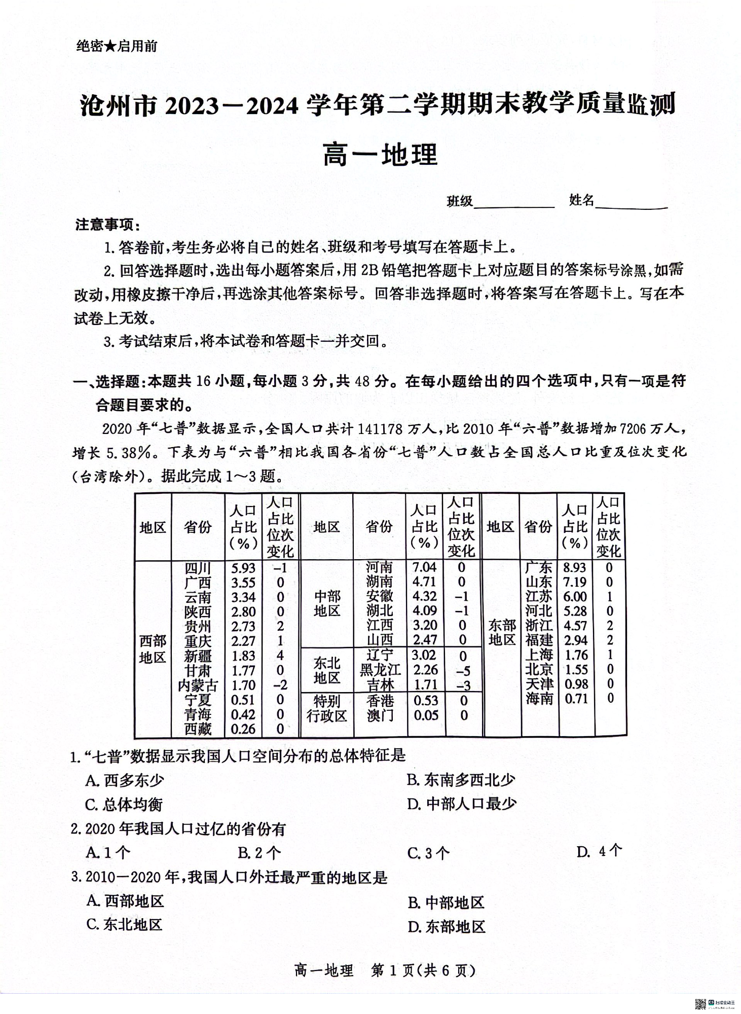 河北省沧州市2023-2024学年高一下学期7月期末教学质量检测 地理