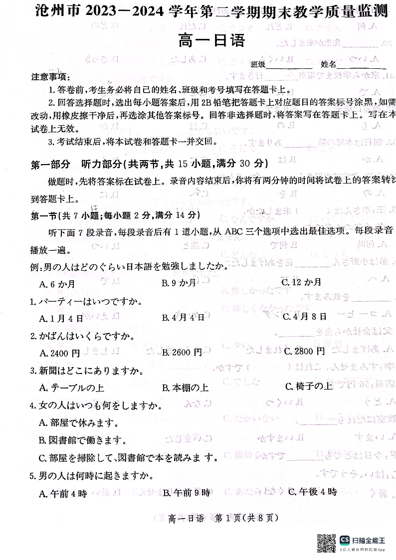 河北省沧州市2023-2024学年高一下学期7月期末教学质量检测 日语