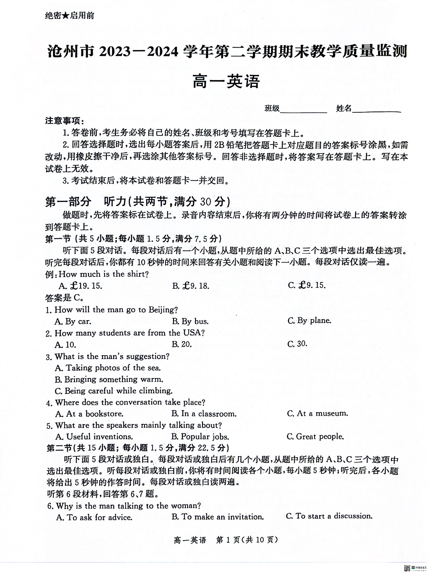 河北省沧州市2023-2024学年高一下学期7月期末教学质量检测 英语