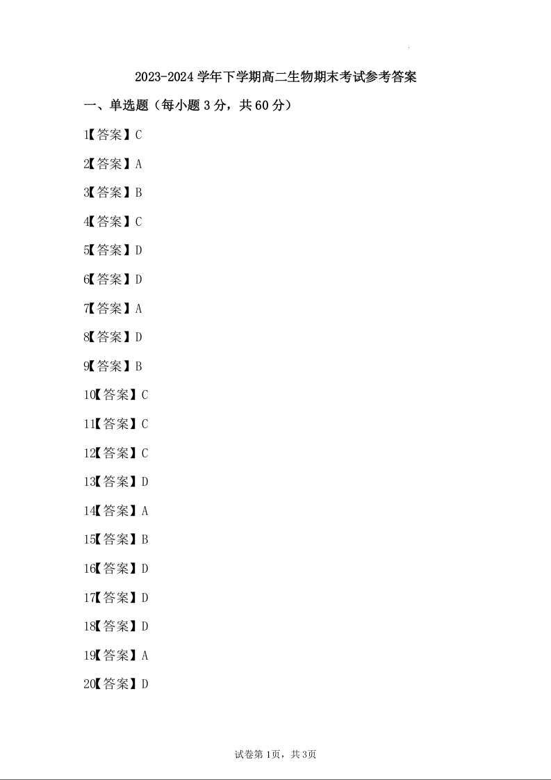 河南省许昌市2023-2024学年高二下学期7月期末教学质量检测 生物答案