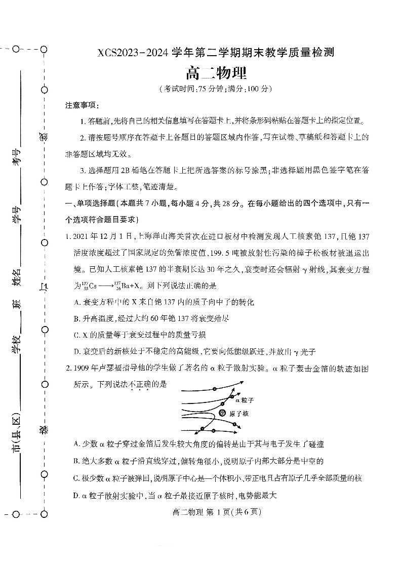 河南省许昌市2023-2024学年高二下学期7月期末教学质量检测 物理