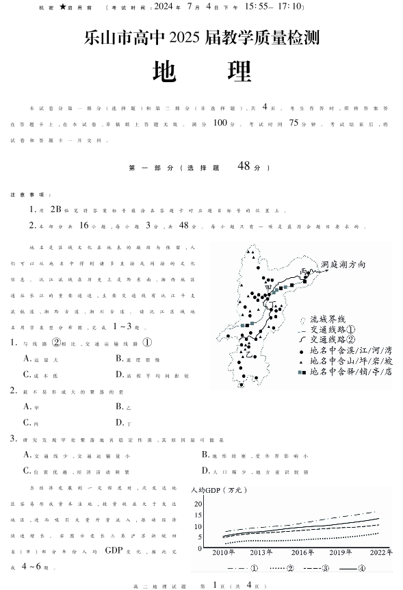 四川省乐山市2023-2024学年高二下学期期末教学质量检测 地理