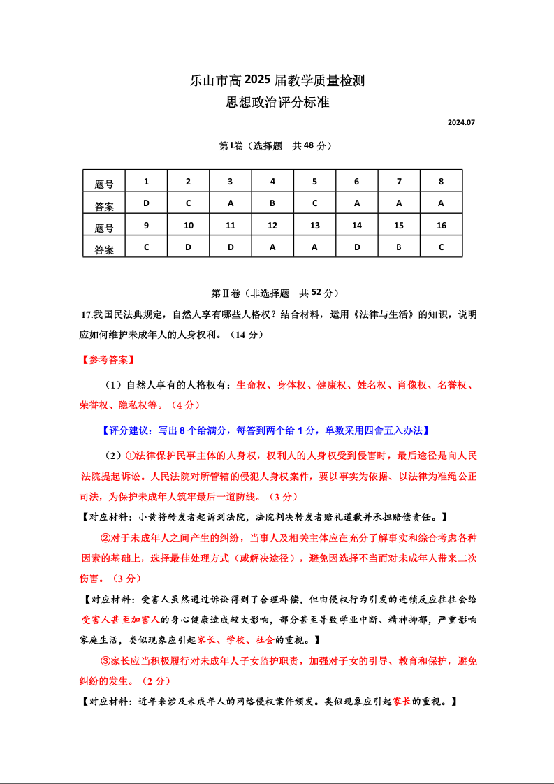 四川省乐山市2023-2024学年高二下学期期末教学质量检测 政治答案