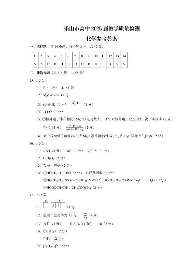 四川省乐山市2023-2024学年高二下学期期末教学质量检测 化学答案
