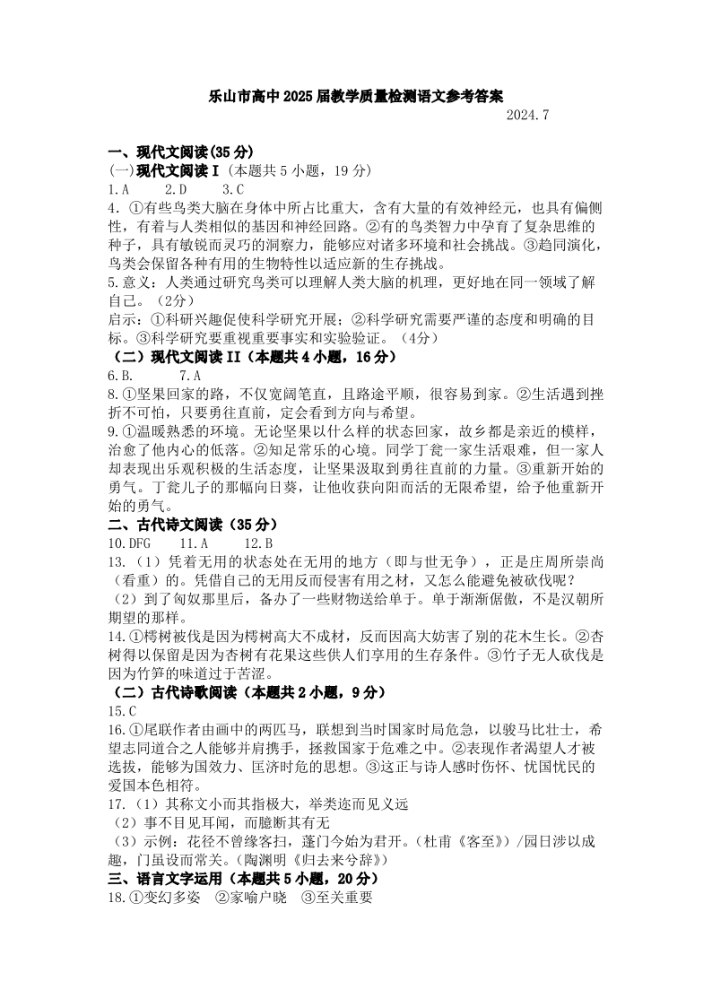四川省乐山市2023-2024学年高二下学期期末教学质量检测 语文答案