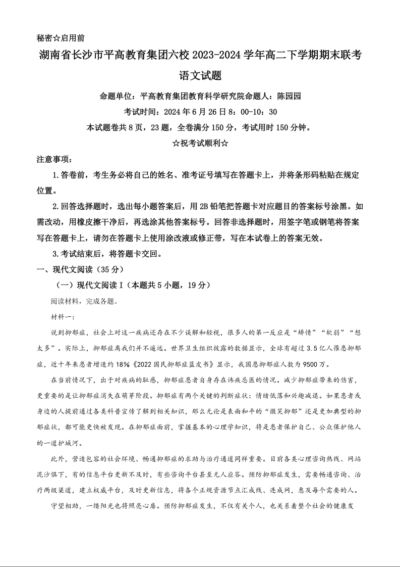 湖南省长沙市平高教育集团六校2023-2024学年高二下学期期末联考 语文
