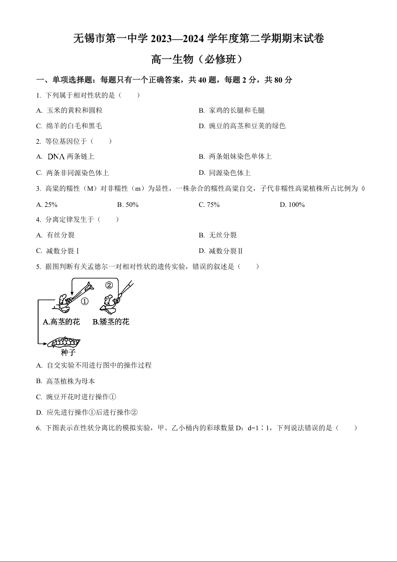 江苏省无锡市滨湖区无锡第一中学2023-2024学年高一下学期6月期末考试 生物