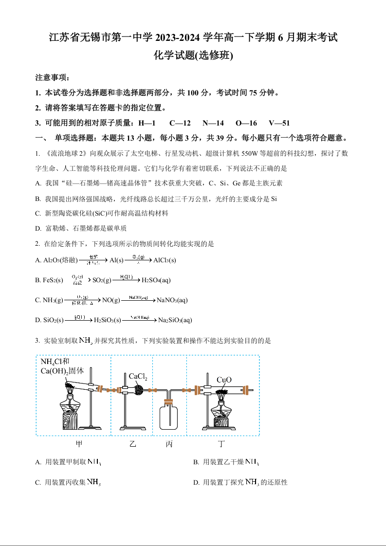 江苏省无锡市滨湖区无锡第一中学2023-2024学年高一下学期6月期末考试 化学