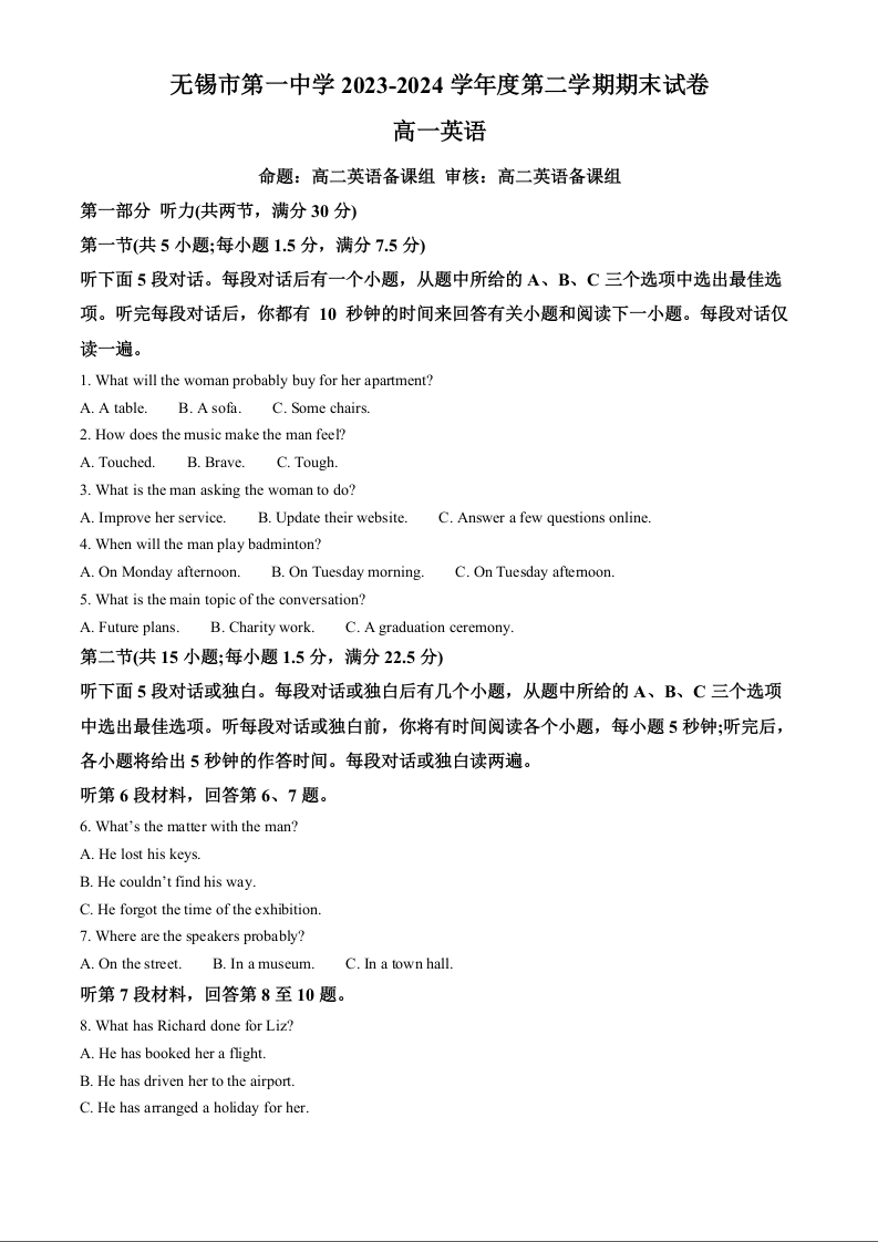 江苏省无锡市滨湖区无锡第一中学2023-2024学年高一下学期6月期末考试 英语