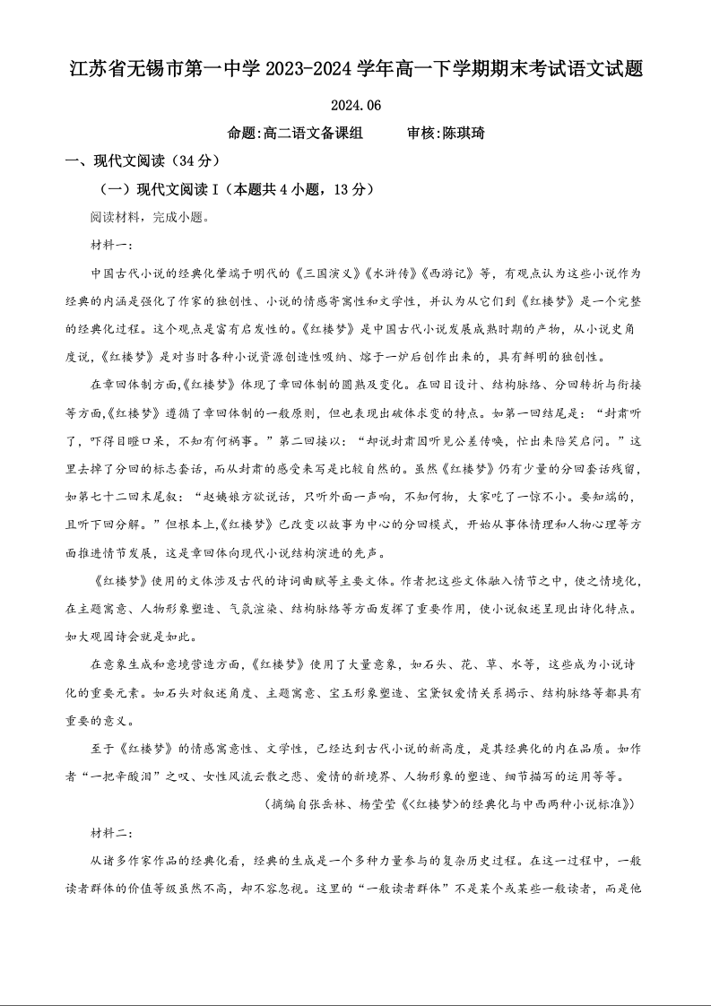 江苏省无锡市滨湖区无锡第一中学2023-2024学年高一下学期6月期末考试 语文