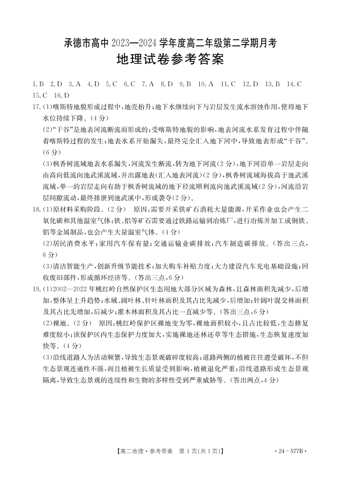河北省承德市2023-2024学年高二年级下学期期末考试 地理答案