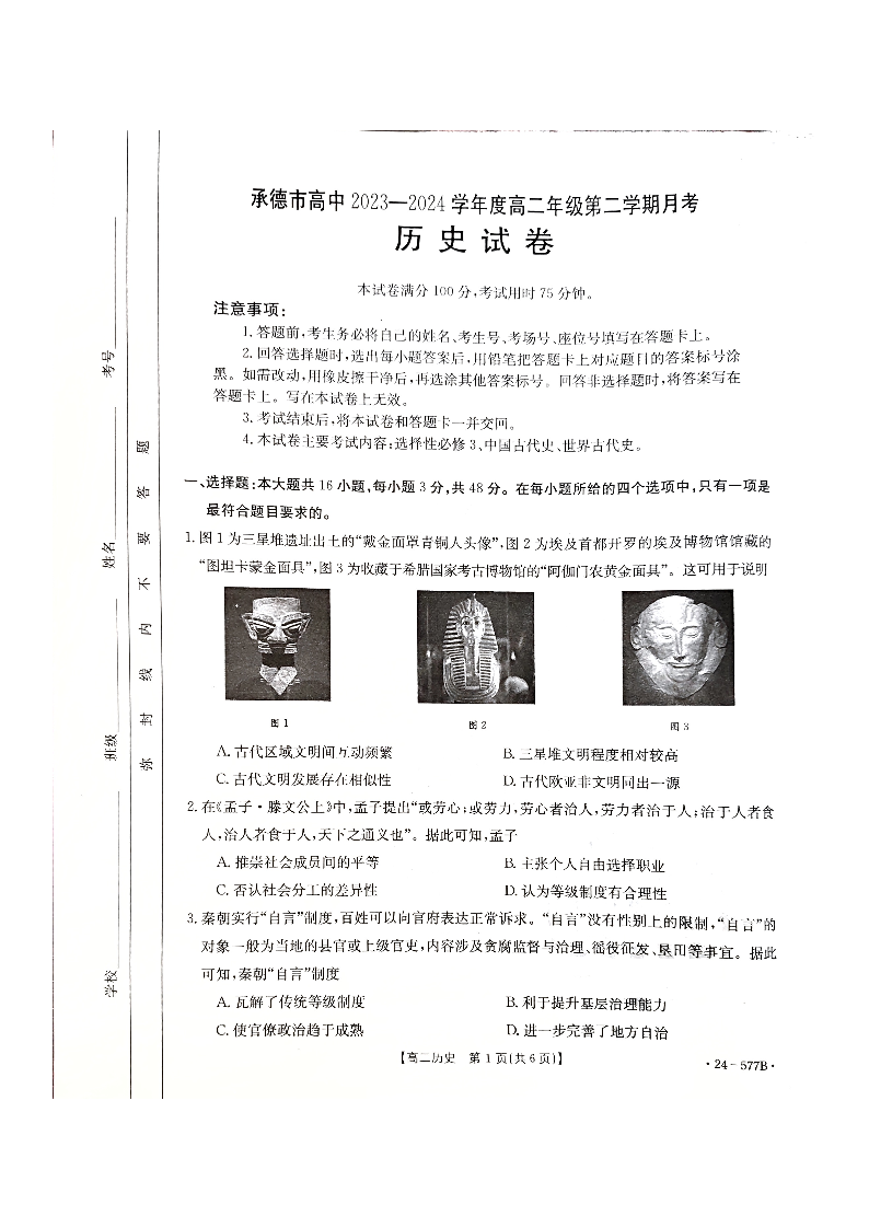 河北省承德市2023-2024学年高二年级下学期期末考试 历史