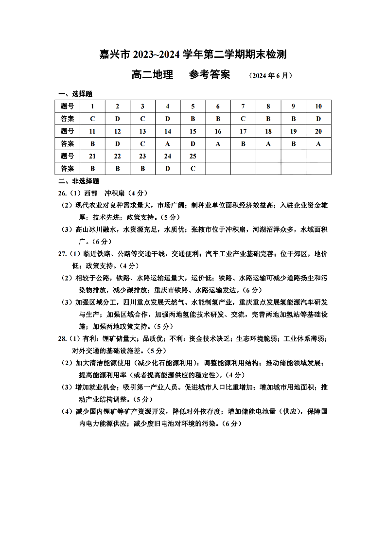 嘉兴市2023-2024学年高二第二学期期末测试 地理答案