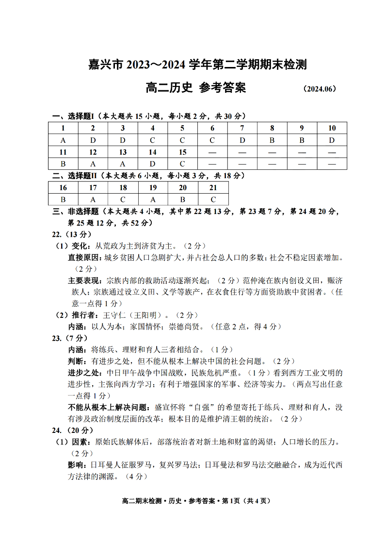 嘉兴市2023-2024学年高二第二学期期末测试 历史答案