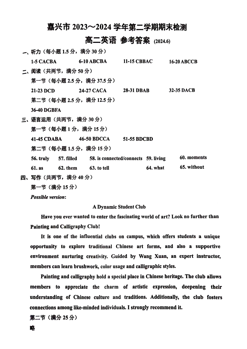 嘉兴市2023-2024学年高二第二学期期末测试 英语答案