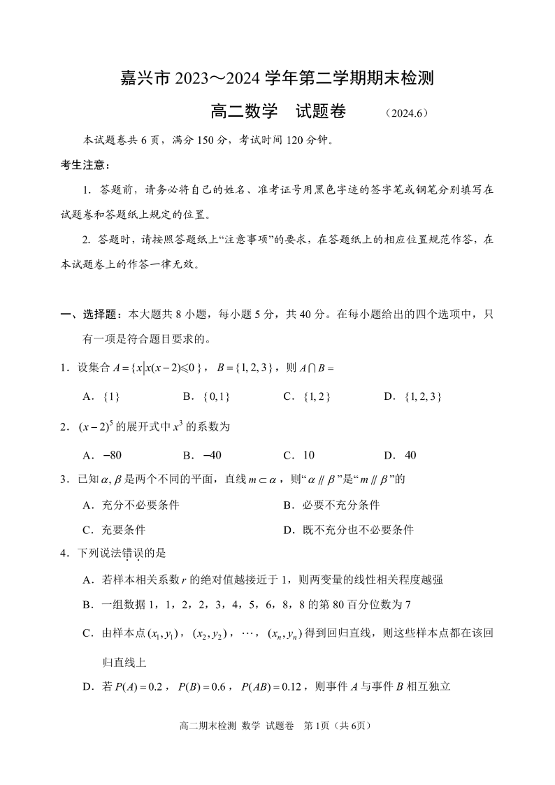 嘉兴市2023-2024学年高二第二学期期末测试 数学