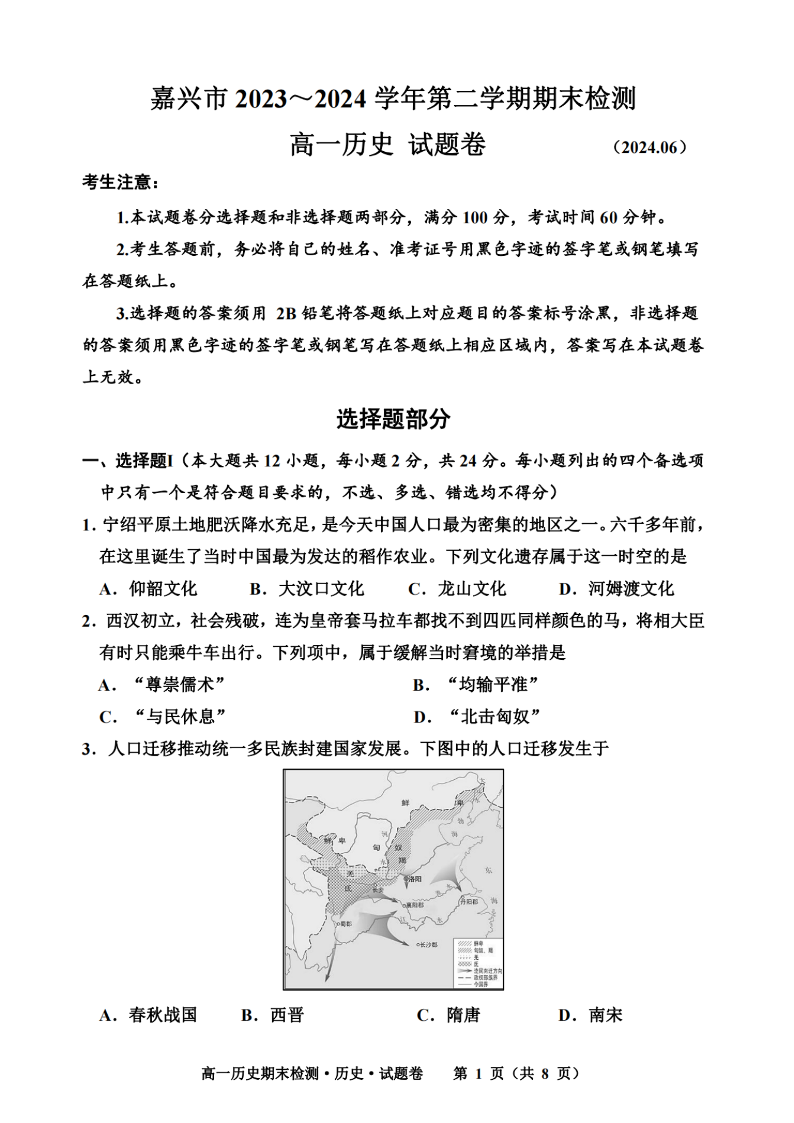 嘉兴市2023-2024学年高一第二学期期末测试 历史