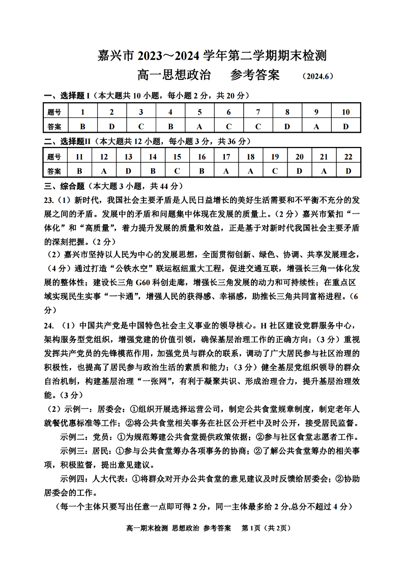 嘉兴市2023-2024学年高一第二学期期末测试 政治答案