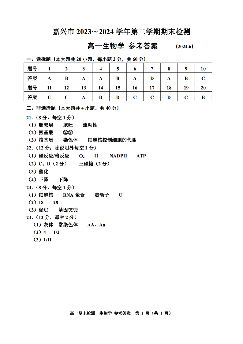 嘉兴市2023-2024学年高一第二学期期末测试 生物答案