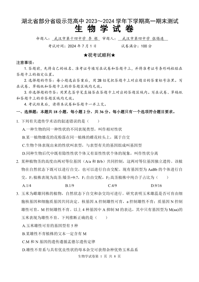 湖北省部分省级示范高中2023-2024学年高一下学期期末测试 生物