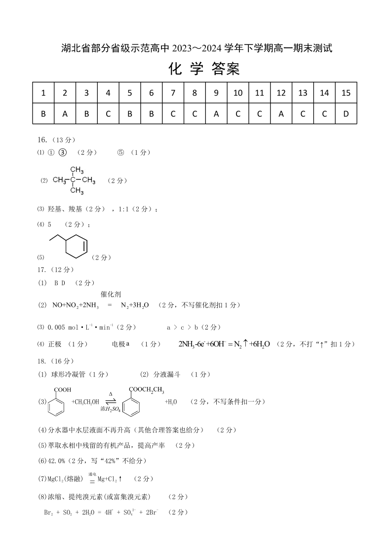 湖北省部分省级示范高中2023-2024学年高一下学期期末测试 化学答案