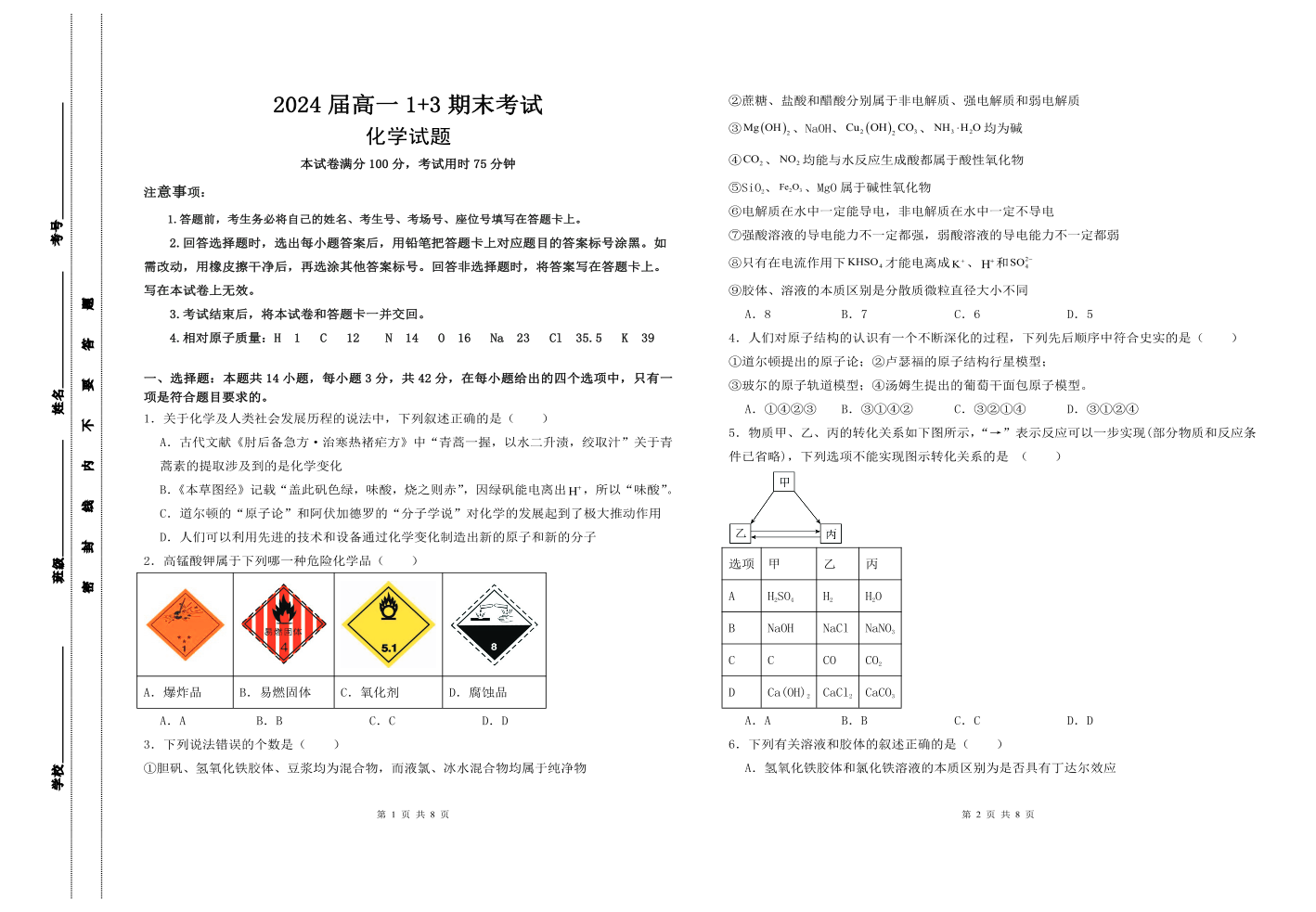 河北省保定市部分高中2023-2024学年高一下学期期末考试 化学