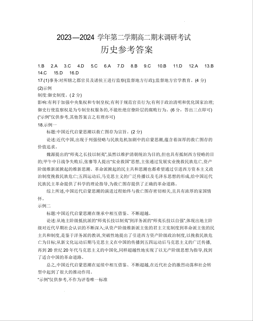 河北省保定市2023-2024学年高二下学期期末调研考试 历史答案