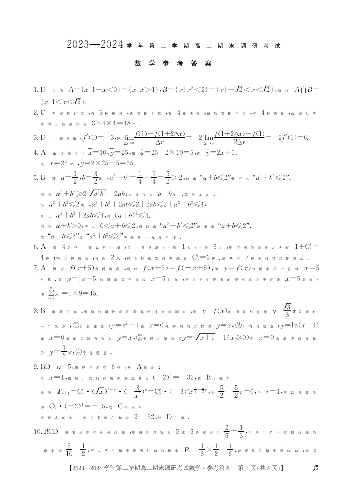 河北省保定市2023-2024学年高二下学期期末调研考试 数学答案