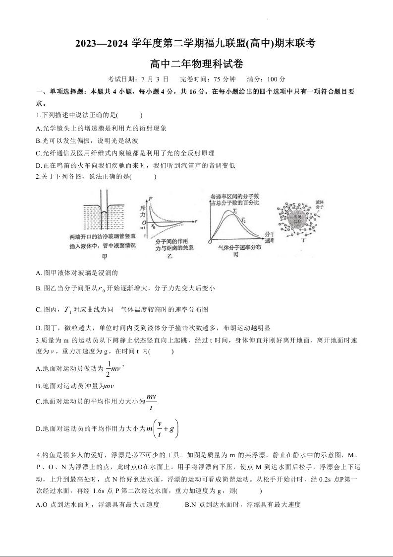 福建省福州市九县(市、区)一中2023-2024学年高二下学期7月期末联考 物理
