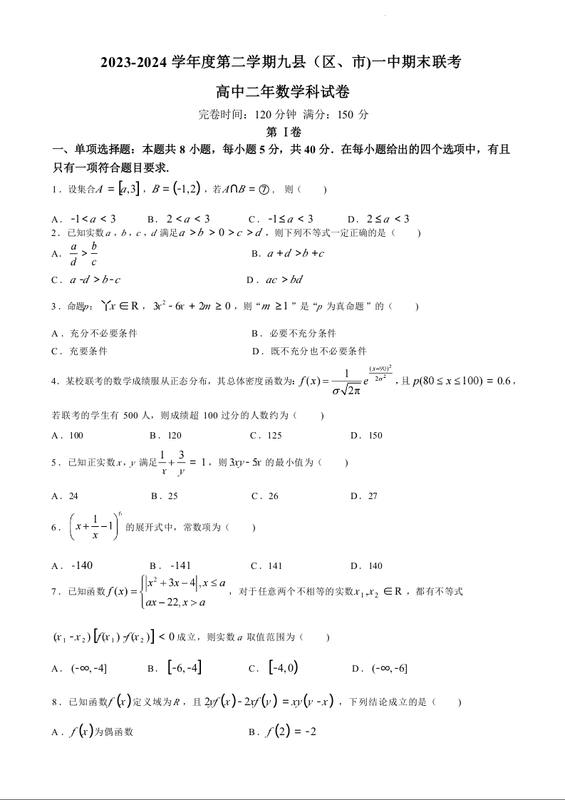 福建省福州市九县(市、区)一中2023-2024学年高二下学期7月期末联考 数学