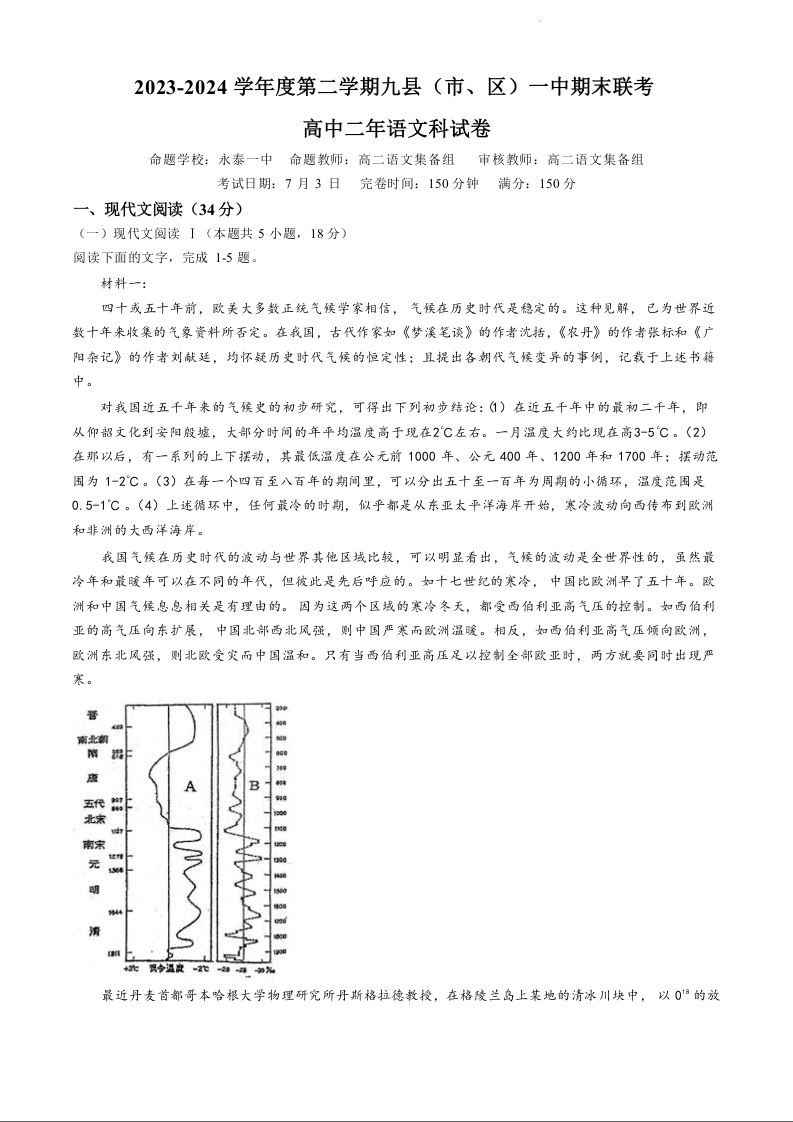 福建省福州市九县(市、区)一中2023-2024学年高二下学期7月期末联考 语文