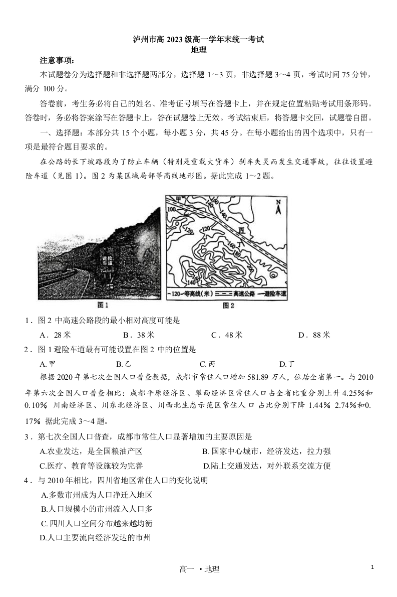 四川省泸州市高2023级高一学年末统一考试 地理
