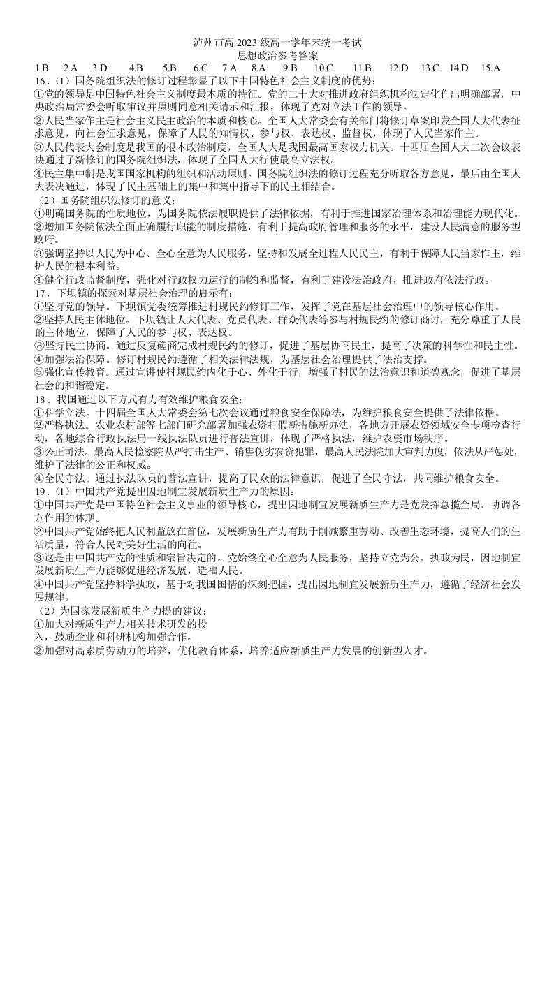 四川省泸州市高2023级高一学年末统一考试 政治答案