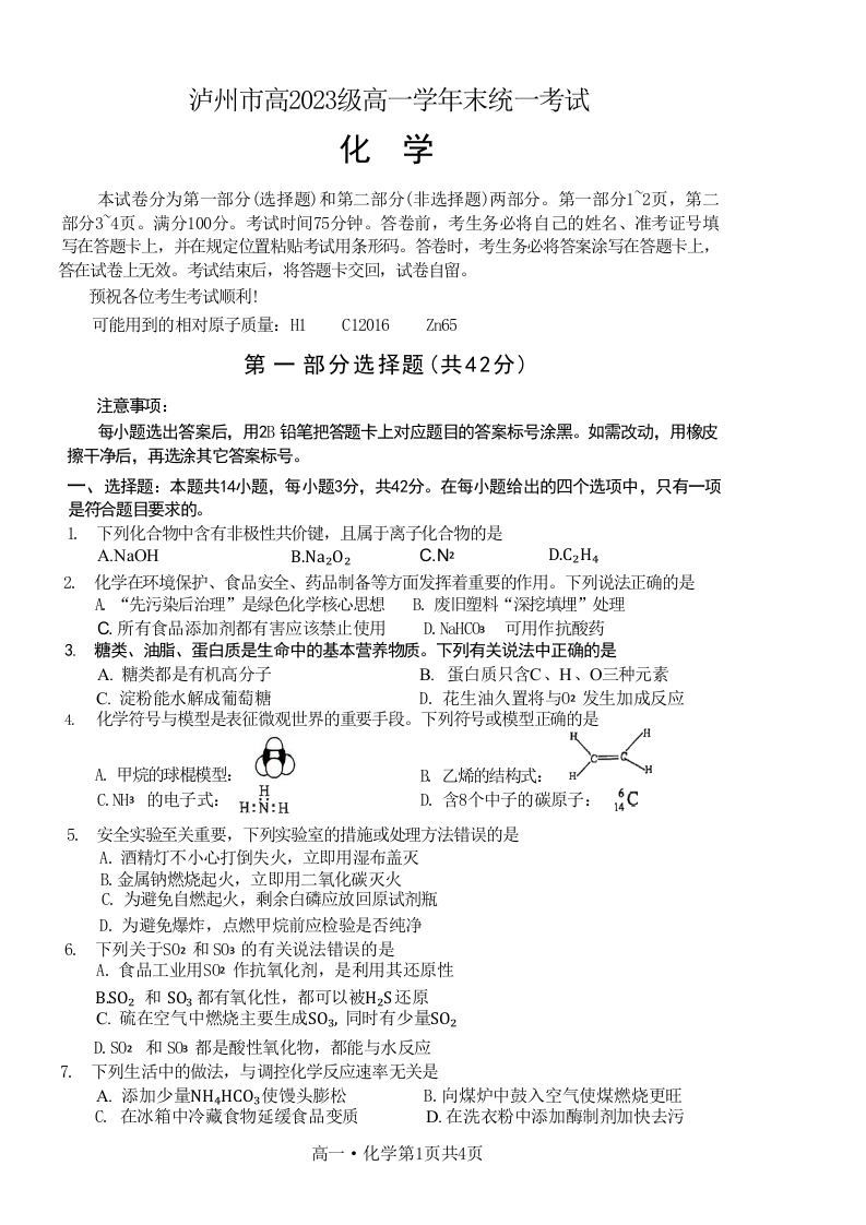 四川省泸州市高2023级高一学年末统一考试 化学