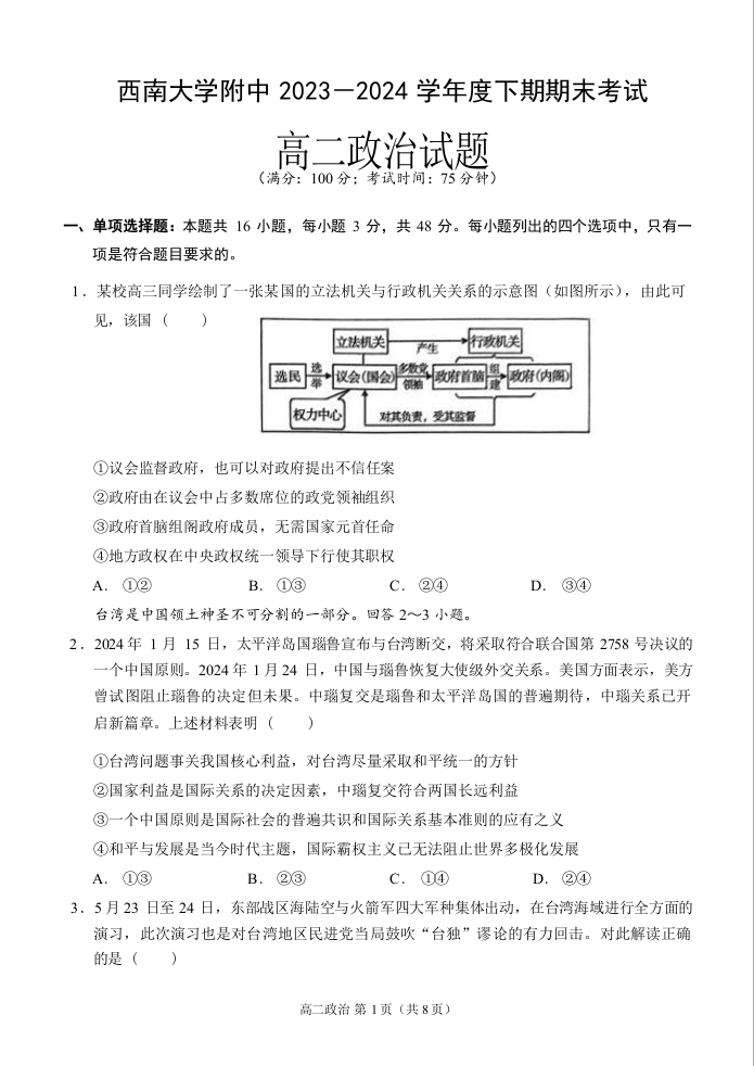 重庆市西南大学附属中学校2023—2024学年高二下学期期末考试 政治