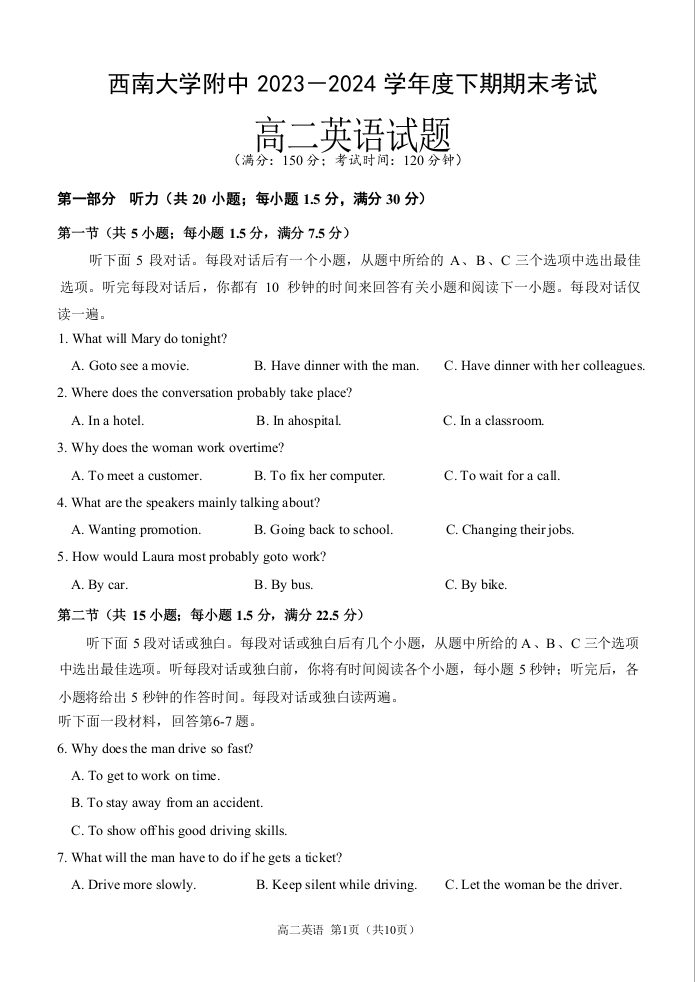 重庆市西南大学附属中学校2023—2024学年高二下学期期末考试 英语