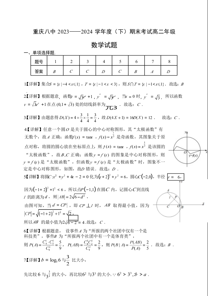 重庆市西南大学附属中学校2023—2024学年高二下学期期末考试 数学答案