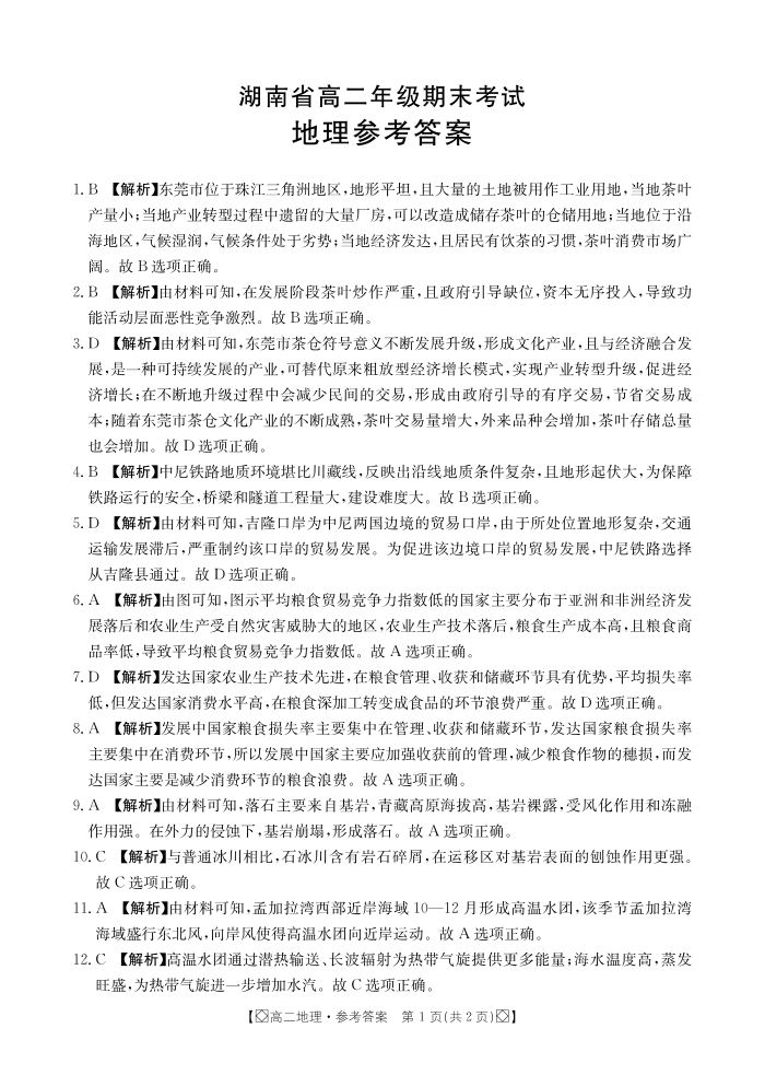 湖南省湘西2023-2024学年高二下学期期末考试 地理答案