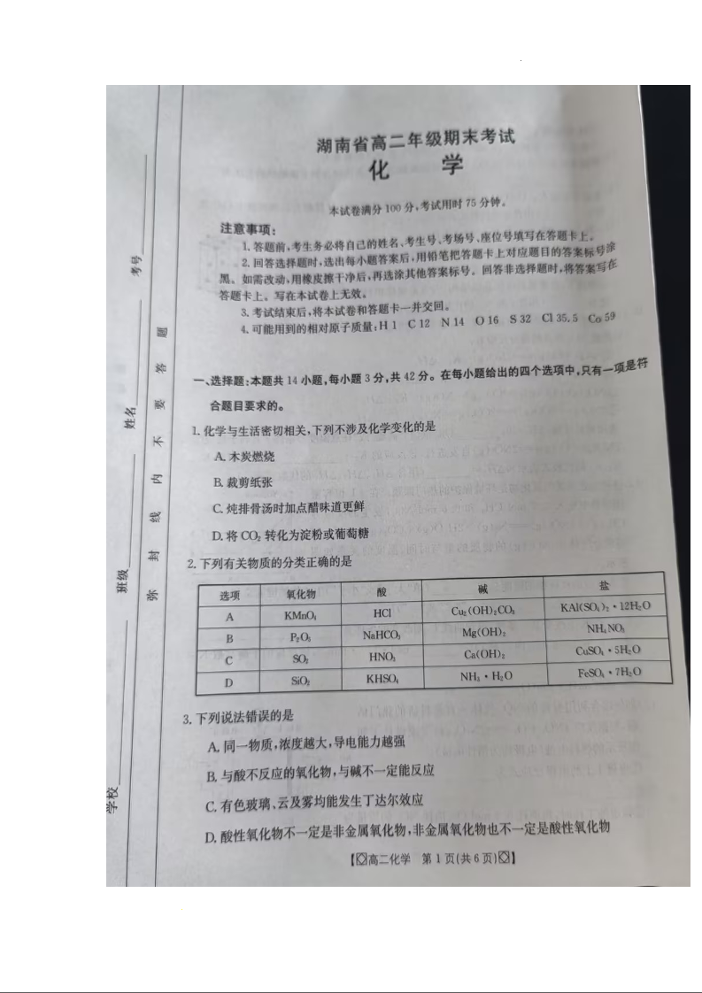 湖南省湘西2023-2024学年高二下学期期末考试 化学