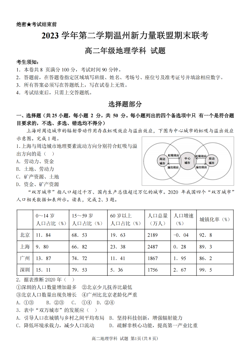 温州新力量联盟2023学年高二第二学期期末联考 地理