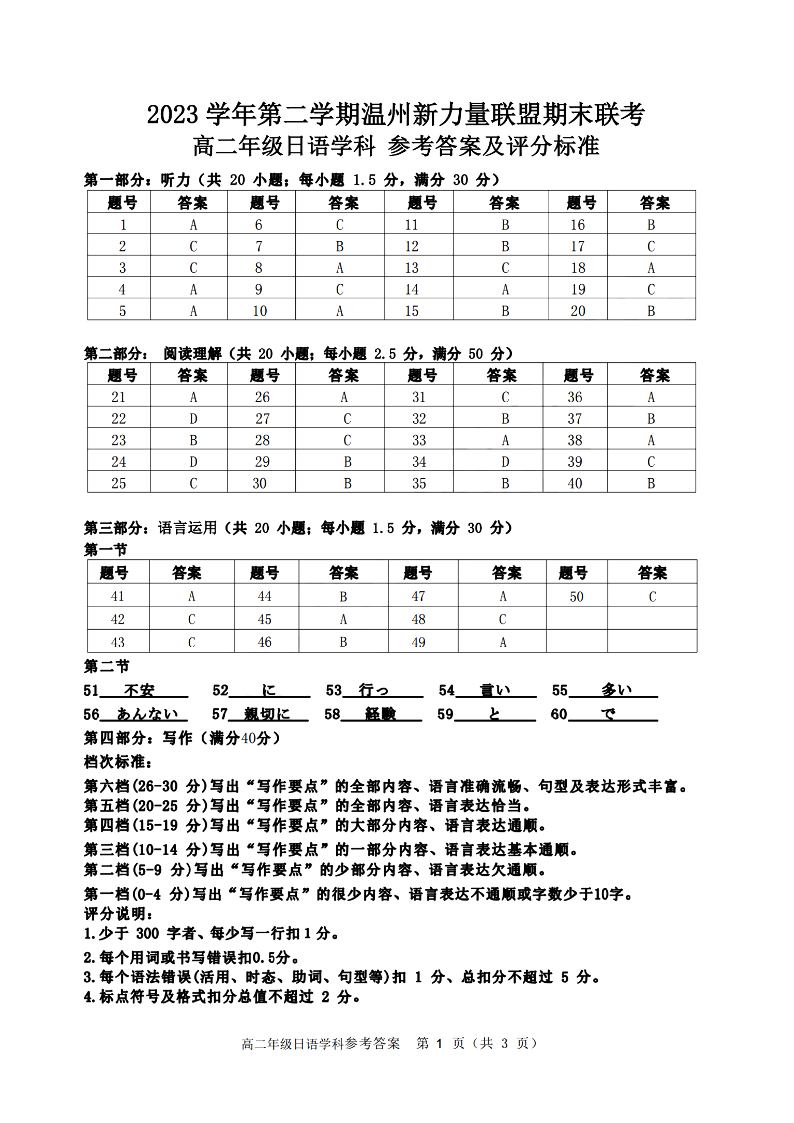 温州新力量联盟2023学年高二第二学期期末联考 日语答案