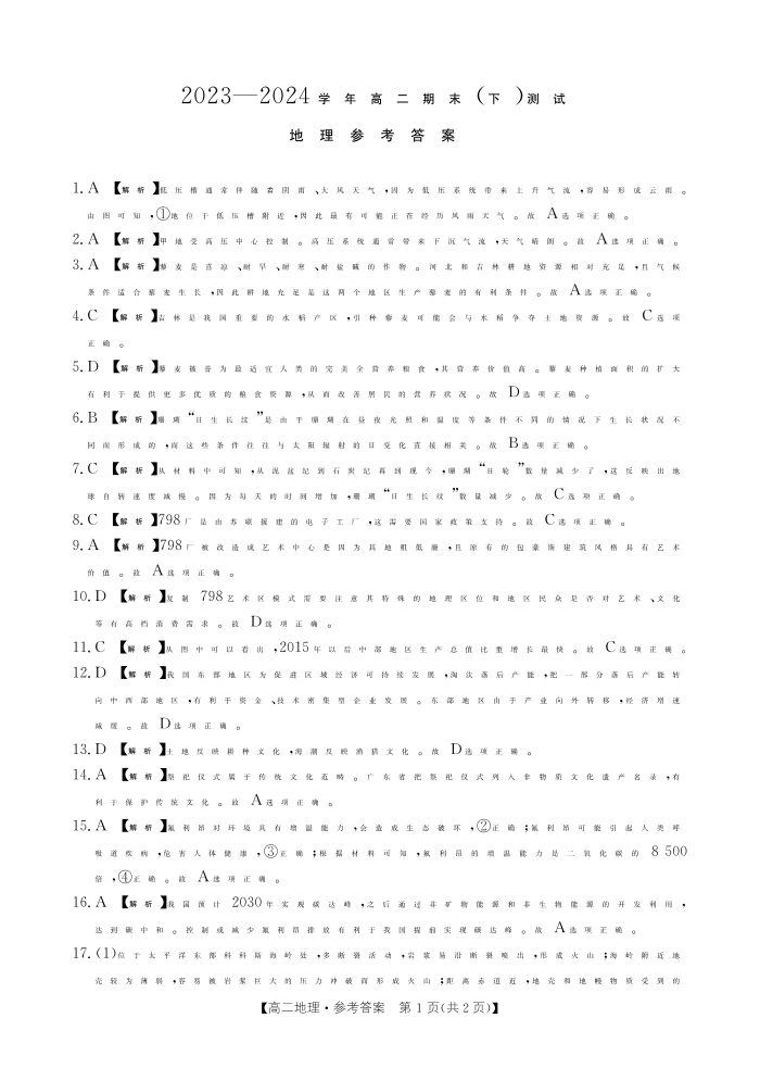 河南省新乡市2023-2024学年高二下学期期末考试 地理答案