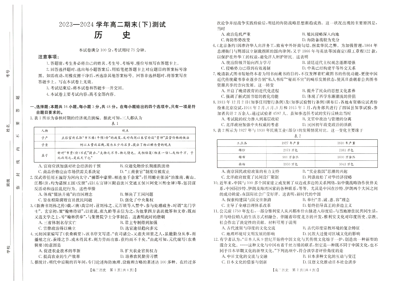 河南省新乡市2023-2024学年高二下学期期末考试 历史