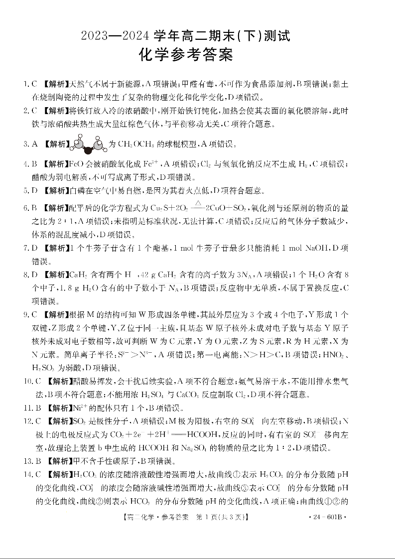 河南省新乡市2023-2024学年高二下学期期末考试 化学答案