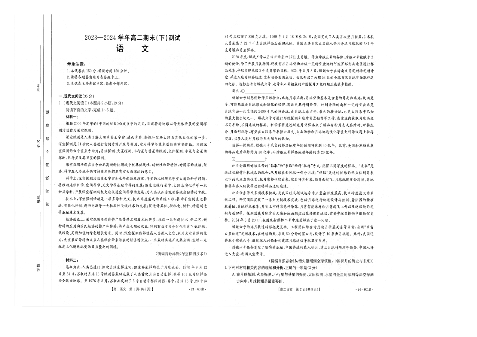 河南省新乡市2023-2024学年高二下学期期末考试 语文